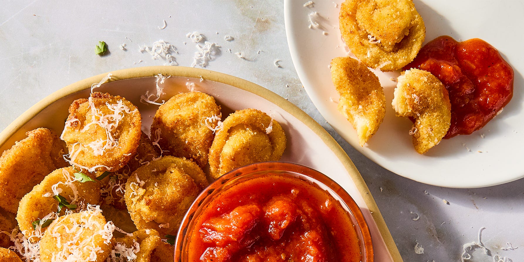 First, you’re going to want to cook your tortellini until they're al dente. Then you’ll want to prep a dredging station. Pour flour into one bowl, beaten eggs in another, and your breadcrumb mixture into a third bowl. Dip the tortellini into the flour, then the eggs, and then the breadcrumbs. Fry them in batches in hot oil for about 1 minute per side before seasoning them with salt. Serve them with parsley, more Parmesan, and a bowl of marinara for dipping.